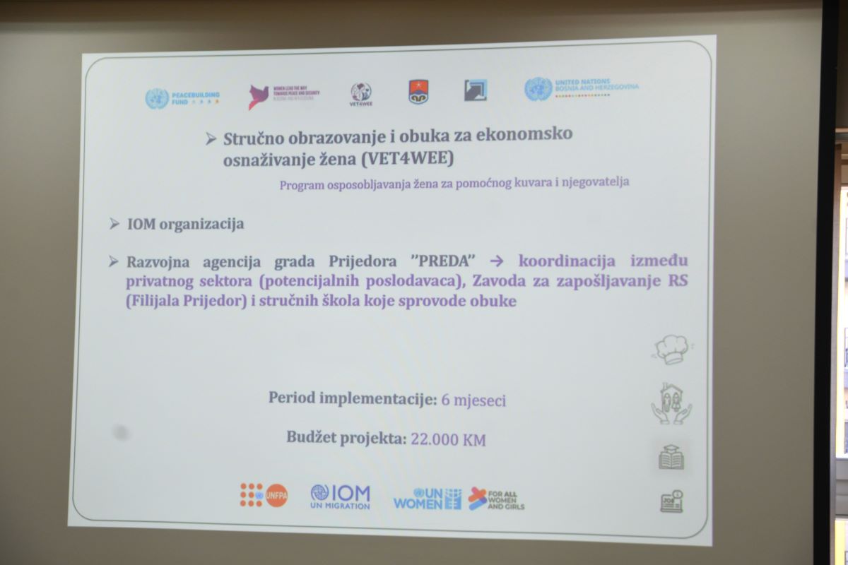 “Ekonomski osnažene žene aktivnije učestvuju u društvenim procesima i doprinose stabilnijem okruženju. Konačni cilj je da što veći broj učesnica nakon obuke dobije zaposlenje”, rekao je Purić, dodajući da se projekat realizuje u 22 lokalne zajednice u BiH, među kojima je i Prijedor.