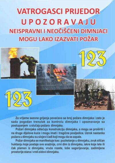 Ukoliko dođe do zapaljenja dimnjaka, odmah pozovite vatrogasce na broj 123.